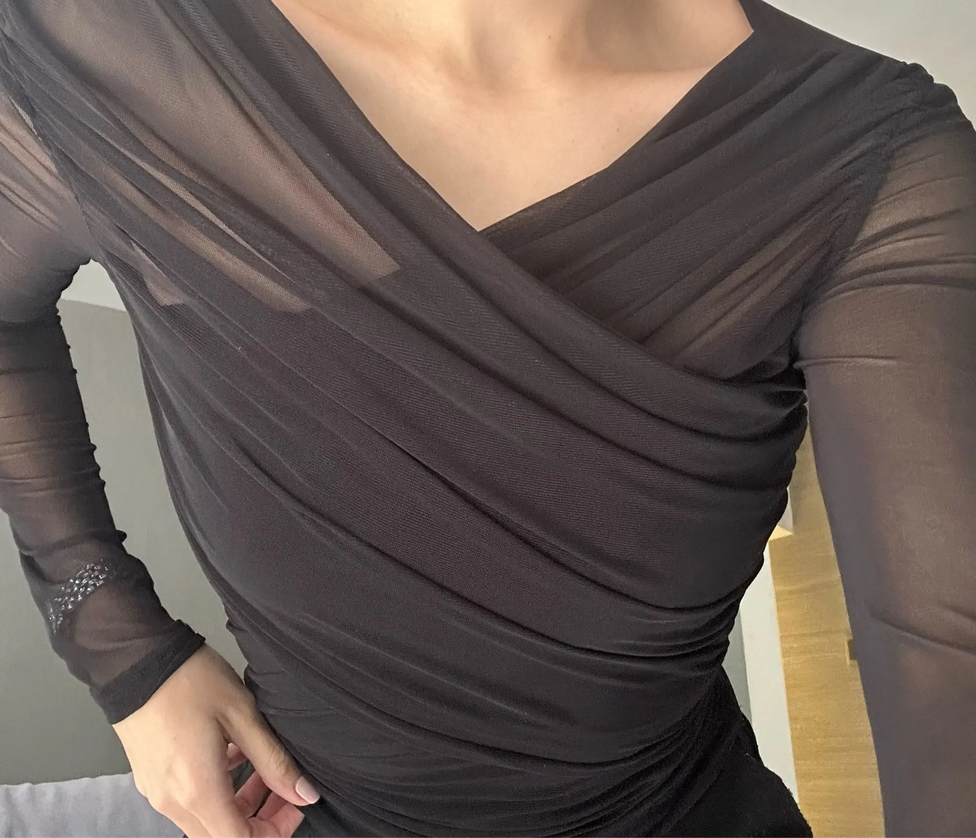 The top looks great, very elegant. It is stretchy, but I would recommend buying the largest size. I'm size S, bought size M and although it fits ok, I wish I ordered L.